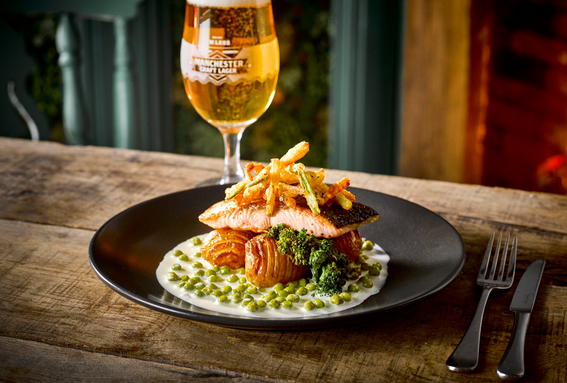 (V) – suitable for vegetarians, (VG) – suitable for vegans, (VGA) – vegan option available, (NGCI) – No Gluten Containing Ingredients, * Can be cooked without gluten. POA = Price On Application. Please ask your server for the price. lf you suffer from a food related allergy please inform a team member for advice before you order. Not all ingredients are listed on the menu & our kitchen uses nuts, gluten and other allergens. Although every care is taken to prevent cross contamination of allergens we cannot guarantee it. Should the listed product be unavailable due to circumstances affecting the supply chain it may be replaced by a similar alternative product. Fish may contain bones. Cooking oil may contain genetically modified ingredients. The calories listed are per serving, additional items to a dish (eg: sauces) are listed separately. Adults require around 2000kcal per day. Weights stated are uncooked and approximate. Prices are GBP. *MPA is our JW Lees Manchester Pale Ale; a golden ale brewed in Manchester entirely from all British malt.
